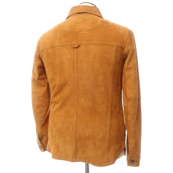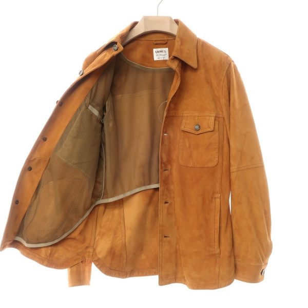 EMMETI(エンメティ)レザーブルゾン/トラッカージャケット/ゴートスキンスエード/オレンジブラウン/状態ランクB/イタリア製/をお買い取りさせていただきました。きめの細かいしっとりとしたゴートスキンスエード素材を使用した、トラッカージャケットです。すっきりとした上品なシルエットと、上質な素材感を感じられるのが魅力の一着。エンメティらしい丁寧な作りで、カジュアルなデザインながらもエレガントな雰囲気を漂わせています。