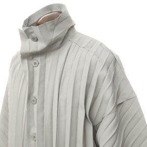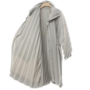 HOMME PLISSE ISSEY MIYAKE(オム プリッセ イッセイミヤケ)ステンカラーコート/春夏 スタンドカラー/グレー/状態ランクA/をお買い取りさせていただきました。程よくハリのあるドライタッチなポリエステル系生地を使用した、春夏物のスタンドカラープリーツロングコートです。独特なプリーツ加工により圧倒的な存在感を漂わせています。ボリューム感を持たせたゆとりのある美しいシルエットにブランドの拘りが感じられ、着るだけで他の人とは明らかに一味違う洒落感を演出してくれる仕上がりになっています。