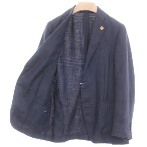 LARDINI(ラルディーニ)アンコン仕立ての3Bカジュアルジャケット/ネイビー/状態ランクB/イタリア製/をお買い取りさせていただきました。ドライタッチなリネンコットン生地を使用した、アンコン仕立ての3Bカジュアルジャケットです。ヘリンボーンやハウンドトゥース、ストライプなどの柄が切り替えられています。副素材控えめに仕立てた、高温多湿の日本の気候に適した一着。都会的で程よく細身のきれいなシルエットが、ラルディーニらしい一着に仕上がっています。