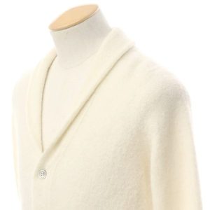 Settefili Cashmereは、「糸から製品まで」を一貫して管理するニット専業ブランドとして知られ、アルパカやカシミア、ウールなど天然素材の扱いに定評があります。ショールカラーカーディガンは、首元に程よいボリュームを持たせたデザインで、ジャケット感覚でも着用できる汎用性の高いアイテム。柔らかなオフホワイトカラーは、秋冬の装いを品よくまとめてくれます。