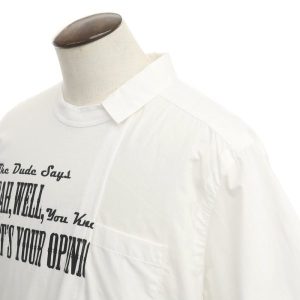 Sacai(サカイ)半袖Tシャツ/Big Lebowskiコラボ/ホワイト/状態ランクA/日本製/ドッキング/をお買い取りさせていただきました。Big LebowskiとのコラボTシャツです。張りのあるコットン地の半袖シャツとクルーネックTシャツをドッキングしたデザイン。緩やかなシルエットがカジュアルな雰囲気に仕上がっています。