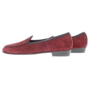 Baudoin & Lange(ボードインアンドランジ)ローファー/ボルドー/状態ランクA/英国製/をお買い取りさせていただきました。300年以上の歴史を持つといわれているベルジャンシューズというルームシューズからインスパイアされたこちらは、Baudoin氏とLange氏が手掛けるシューズブランド「BAUDOIN & LANGE】から。彼らの洗練されたセンスの良さとこだわりからくるディテールや素材選びは、完全にオリジナルなものへと昇華されております。いわゆるローファーのようなモカ縫いではなくパイピングで処理され甲ベルトがつかないのが伝統的なスタイル。まるで一枚革のグローブに包み込まれるような履き心地は、職人のハンドメイドによる作りの良さと裏地のない柔らかなラムスウェードの一枚革からくるもの。ヒールの化粧釘等を見ても、伝統の中に今日的なエッセンスが加わった一足と感じさせます。